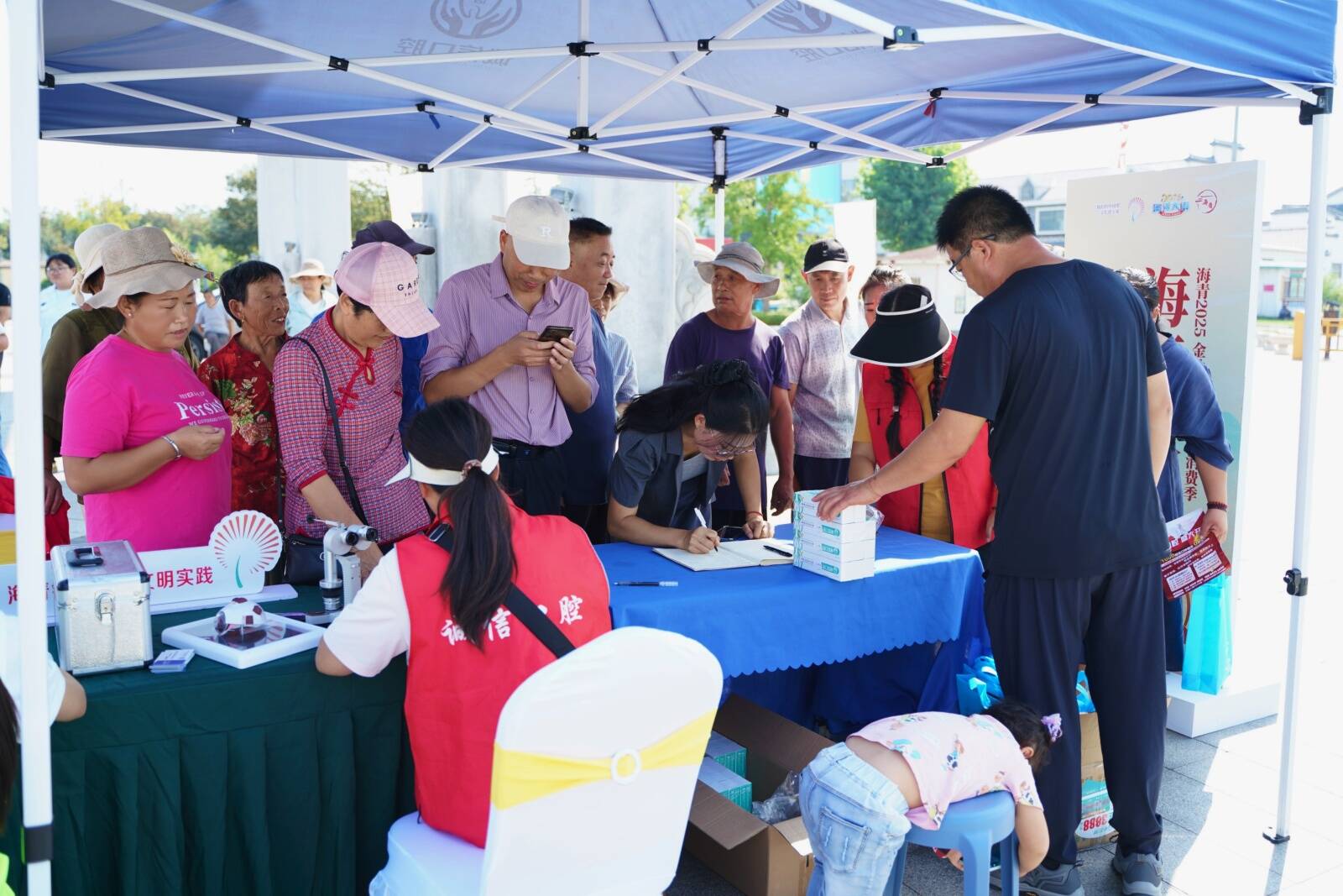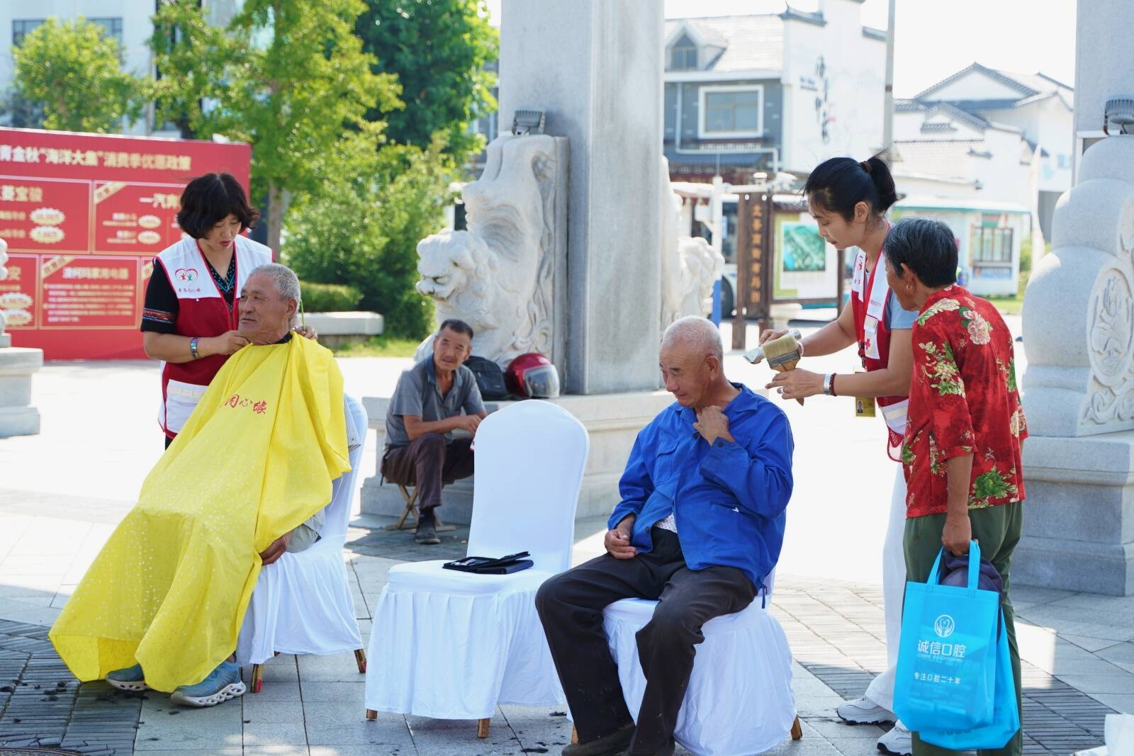 在文明实践便民公益大集,为老人提供健康义诊与爱心义剪。“青青草”卫生院志愿者耐心提供健康咨询、测量血压、普及日常保健知识等服务;同心缘志愿服务队手法娴熟,免费为有需求的老人修剪发型,与老人聊家常的同时宣讲反诈案例或戴头盔文明交通知识,用贴心服务传递文明风尚。