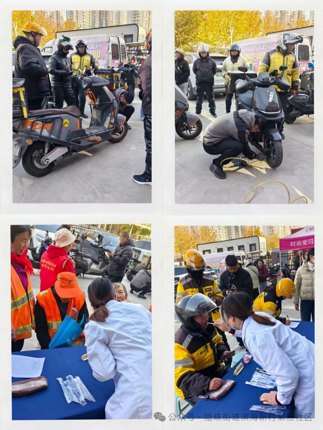 活动现场,多项便民服务精准对接户外工作者核心需求,让关爱更有温度、更具实效。电动车检修服务率先开展,专业维修师傅细致检查每一辆电动车的刹车、轮胎、电瓶等关键部位,逐一排查安全隐患,同时耐心讲解日常保养技巧,为他们的出行安全筑牢“防护墙”。随后,爱心义诊专区前人头攒动,医护人员带着专业设备,免费为大家检查牙齿,细致解防寒保暖、作息调理等健康咨询,并结合户外工作特性给出针对性建议,用专业服务守护一线劳动者的身心健康。