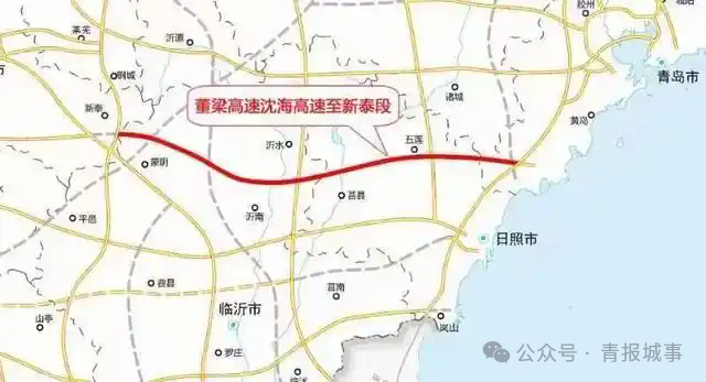 董梁高速沈新段于2023年11月底启动开工,起自西海岸新区沈海高速董家口枢纽,向西途经日照市五莲县、莒县,临沂市沂水县、沂南县、蒙阴县,泰安市新泰市,止于董梁高速新泰至宁阳段新汶枢纽,线路全长约197公里,按双向四车道高速公路标准,其中青岛段约19公里,全部位于西海岸新区。