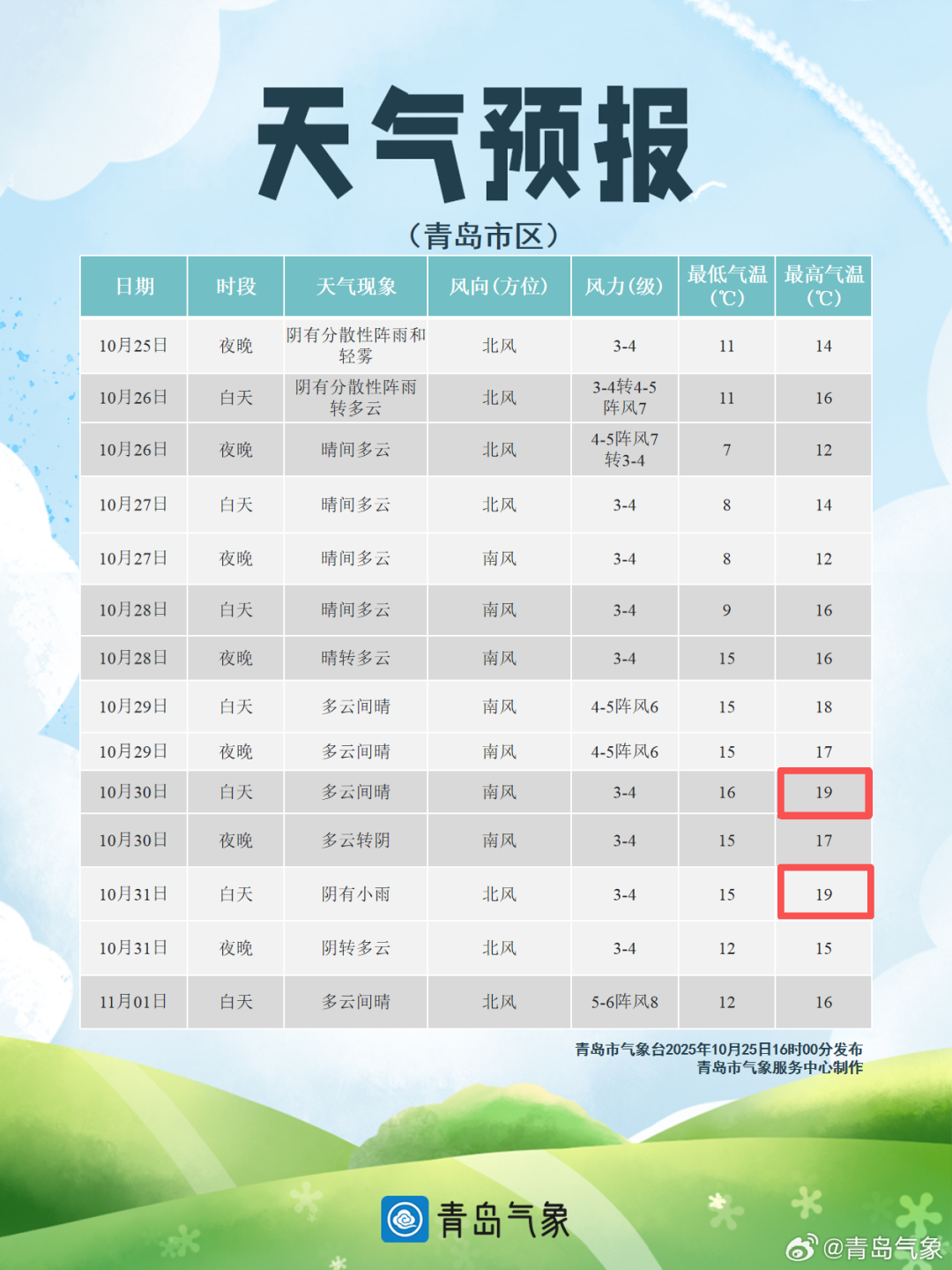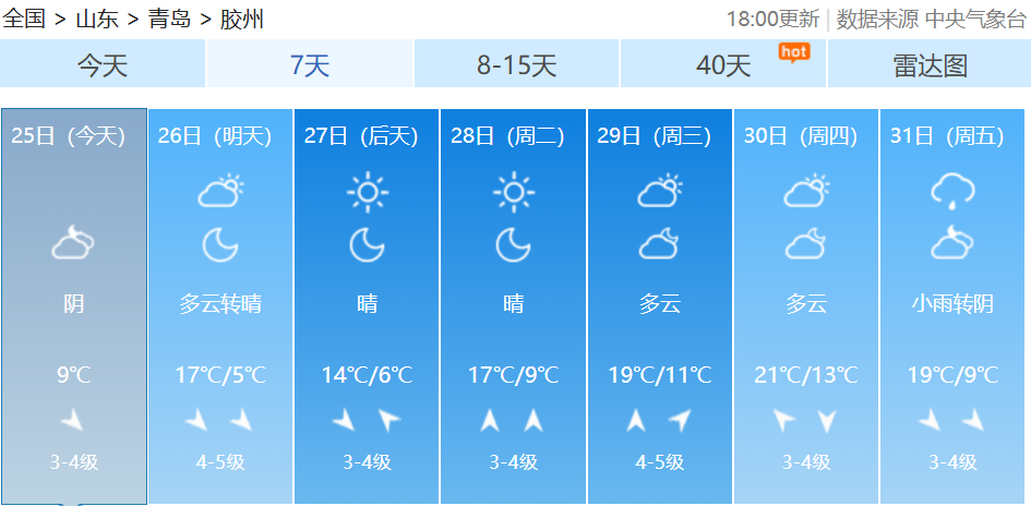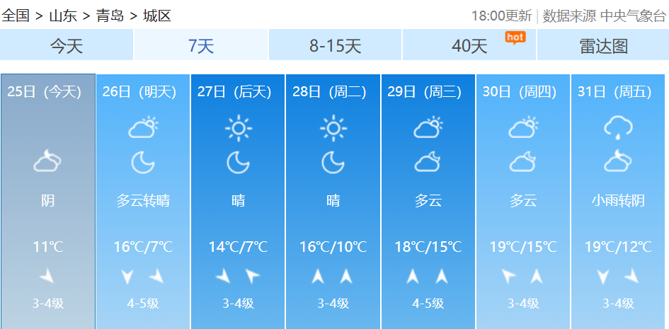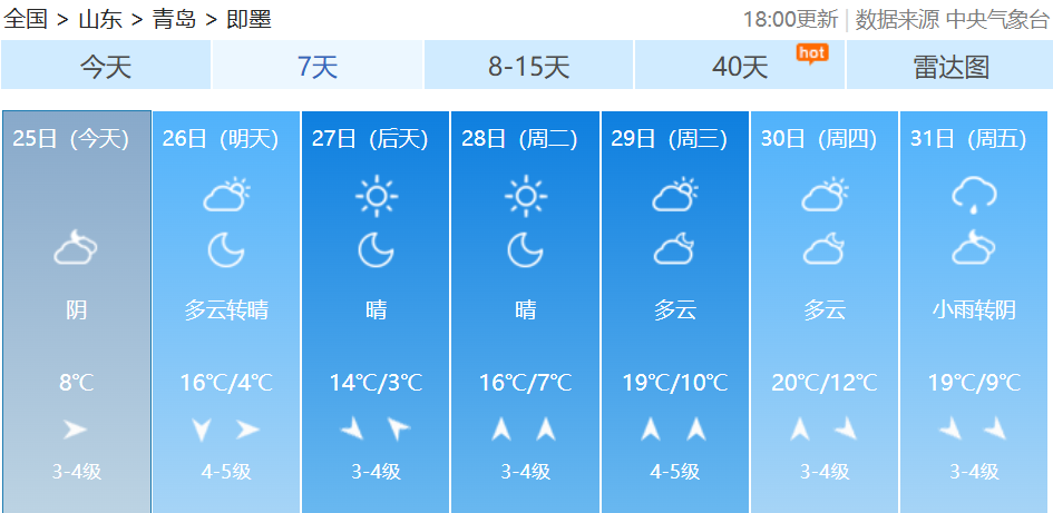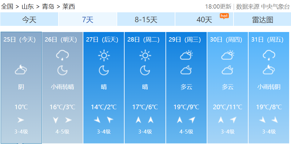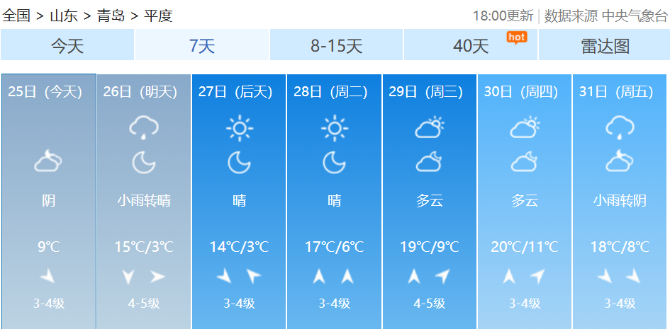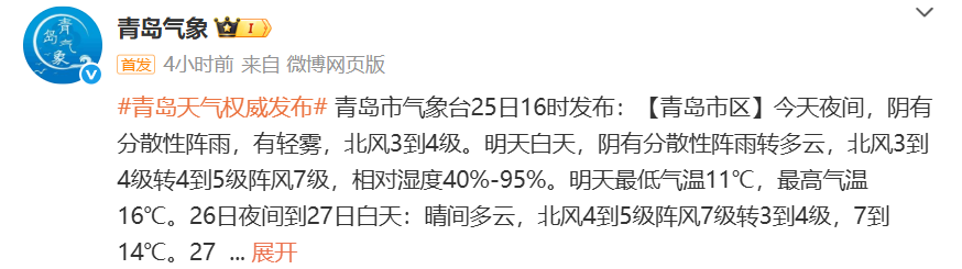 最近我国多地季节转换节奏不同寻常从中国天气网推出的最新全国秋冬进程图来看截至10月22日我国的冬季前沿已经抵达陕西南部、河南北部、山东中部一线据中国天气网气象分析师叶梦龙介绍“相比常年,今年的入冬呈现出气温波动大、季节转换快速、华北等地秋季持续时间偏短三个突出特点。”↓↓↓据@中国天气 消息10月25日起冷空气再袭北方大部未来三天北方多地将再度刷新气温新低内蒙古、黑龙江等地迎较强降雪此外,26日青藏高原降雪持续 青岛天气 据@青岛气象 最新预报新一轮冷空气携降雨、大风、降温赶来↓↓↓10月25日晚上到26日上午,青岛将出现分散性阵雨,预计莱西、平度、西海岸有阵雨出现,北部地区的小伙伴需注意防雨。26日白天,最高气温变化不大,全市在15~17℃之间。预计26日下午到夜间,北风风力逐渐增大,气温开始下降。受降温影响,内陆地区局地会出现霜冻或轻霜冻。预计27日、28日早晨气温较低,各区市最低气温都只有个位数,提醒大家在未来几天要注意及时添衣保暖。青岛市气象台25日16时发布未来三天天气预报↓↓↓【青岛市区】26日白天,阴有分散性阵雨转多云,北风3到4级转4到5级阵风7级,相对湿度40%~95%。26日最低气温11℃,最高气温16℃。26日夜间到27日白天:晴间多云,北风4到5级阵风7级转3到4级,7到14℃。27日夜间到28日白天:晴间多云,南风3到4级,8到16℃。【预报各区】25日夜间到26日白天,阴有分散性阵雨转多云,有轻雾,北风,海上5到6级转6到7级阵风8级,内陆3到4级转4到5级阵风7级。26日最低气温8℃,最高气温17℃。26日夜间到27日白天:晴间多云,内陆局部有霜冻,北风4到5级阵风7级转3到4级。27日夜间到28日白天:晴间多云,内陆局部有霜冻,南风3到4级。据中国天气网预报未来7天受冷空气影响青岛最低温跌至2℃接下来气温快速回升青岛多地最高温直冲20℃↓↓↓转发提醒近日气温波动较大注意增减衣物谨防感冒--------------------●来源:半岛都市报(bandaobao)综合@中国天气、中国天气网、@青岛气象等