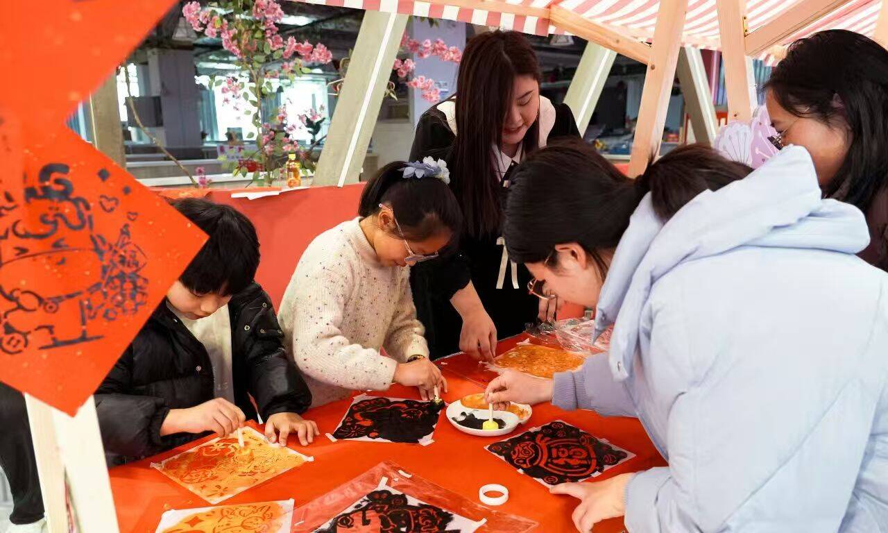 围绕“海洋大集”主题,现场设置22个特色摊位,宛如一个热闹的新春庙会。“免费拓福”活动吸引众多居民参与,大家手持拓印工具,在洒金红纸上亲手拓出吉祥“福”字,笑意盈面;“共绘百福”区域,居民们用金笔共绘马年百福图,将美好祝愿融入笔尖。在非遗手造区,方舟烙画、琅琊铜拓、黄岛剪纸、糖画等摊位前,传承人现场展示技艺,吸引大家驻足体验,孩子们举着刚做好的糖画兴奋不已。