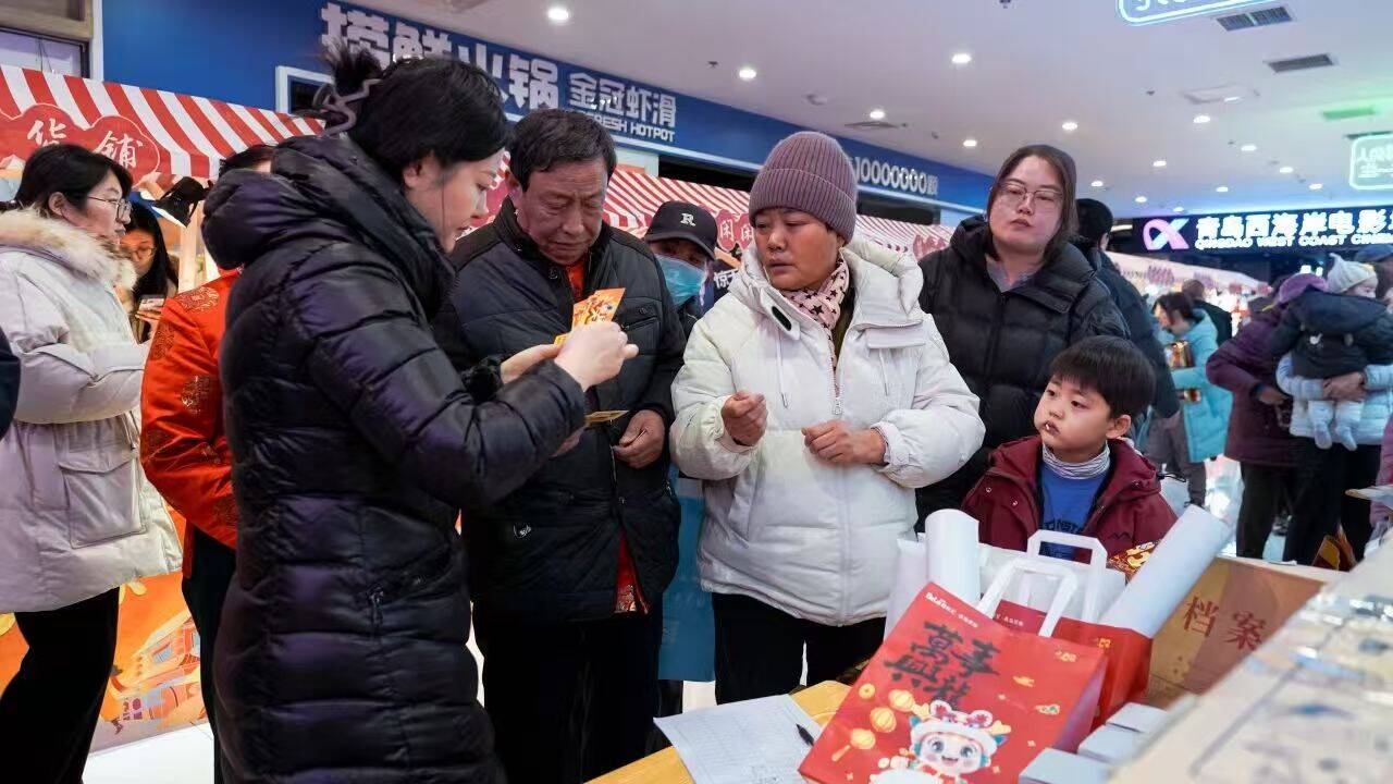 与此同时,年货市集区同样人气旺盛,有来自三间房、瀚林翔的本地农特产年货,有来自青岛森林野生动物世界、大知闲闲毛线铺、团子家珠宝、万事利丝巾、蓝小巫工坊、知欢手作、灰灰杂货铺的文创好物,还有樊文花、益语商集、利客优品、中国福利彩票的各色商品,居民们提着大包小包,在浓浓烟火气中感受采购年货的喜悦。