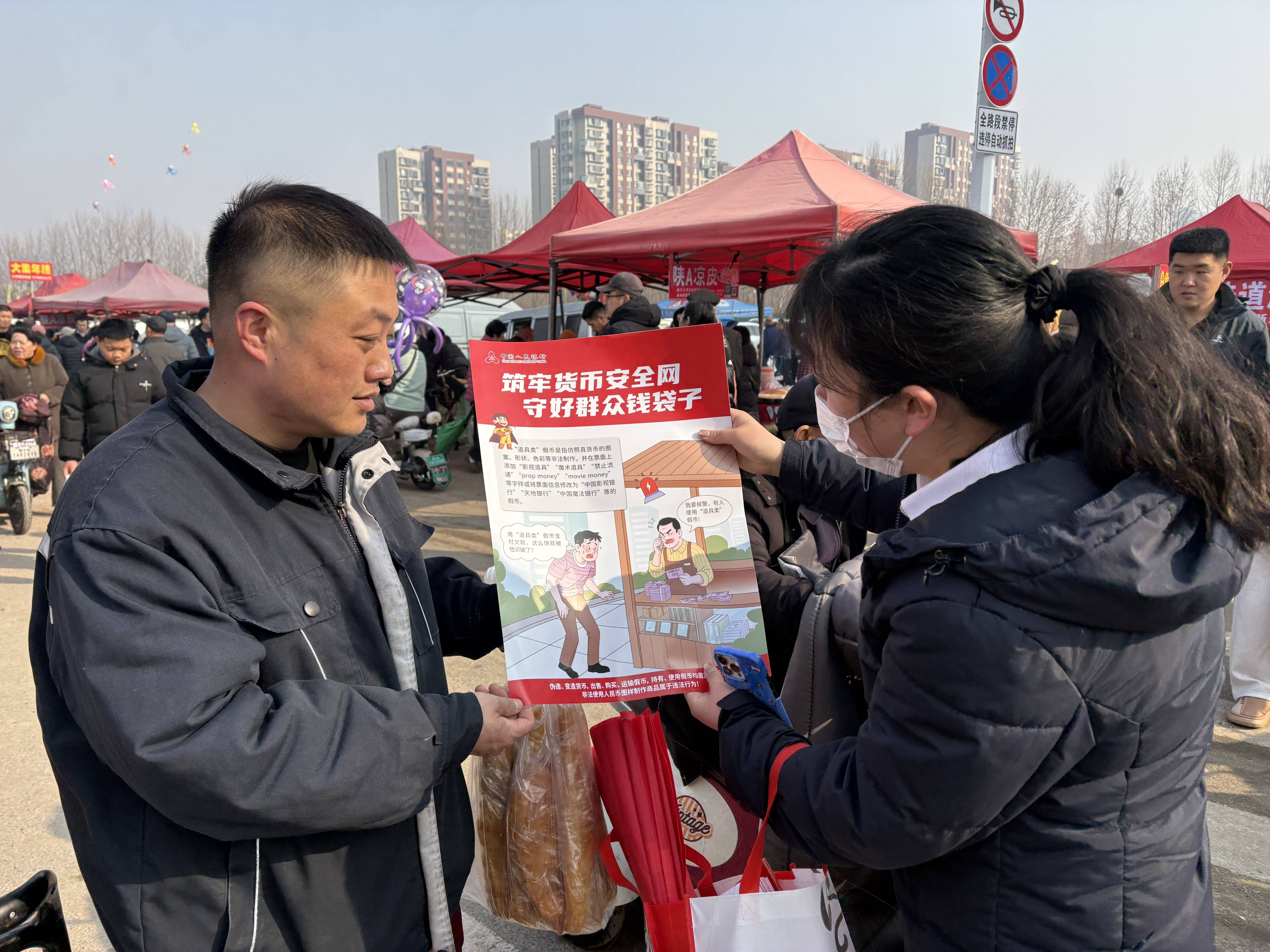活动现场,醒目宣传横幅迎风展,志愿服务队成员化身“金融宣传员”,向赶集市民、商户逐一发放反诈防骗、反假币、存款保险等宣传折页620余份,同时送上新春福贴与美好祝愿。工作人员结合典型案例,反复叮嘱大家牢记“不轻信、不透露、不转账”反诈铁律,遇可疑情况第一时间报警或向银行咨询,筑牢思想防线。针对集市现金交易高频的特点,团队重点演示“一看、二摸、三透光”识假口诀,细致讲解第五套人民币防伪特征、假币识别要点及规范处置流程,手把手指导老年群体、个体商户掌握快速辨假要领,全力避免群众因误收假币蒙受损失。