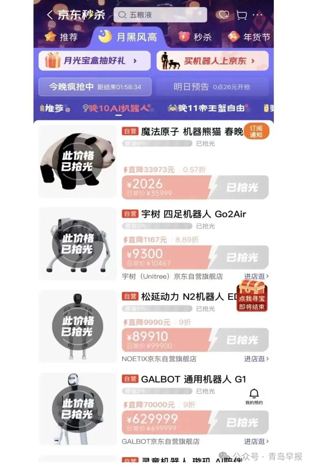 在除夕当晚10点,京东也上架了包括“春晚同款”机器人在内的多款机器人。在活动上线几分钟内,包括魔法原子、宇树科技、松延动力等品牌的机器人即被抢购一空。其中,两台价值近63万元的GALBOT通用机器人G1,同样瞬间被抢购一空。