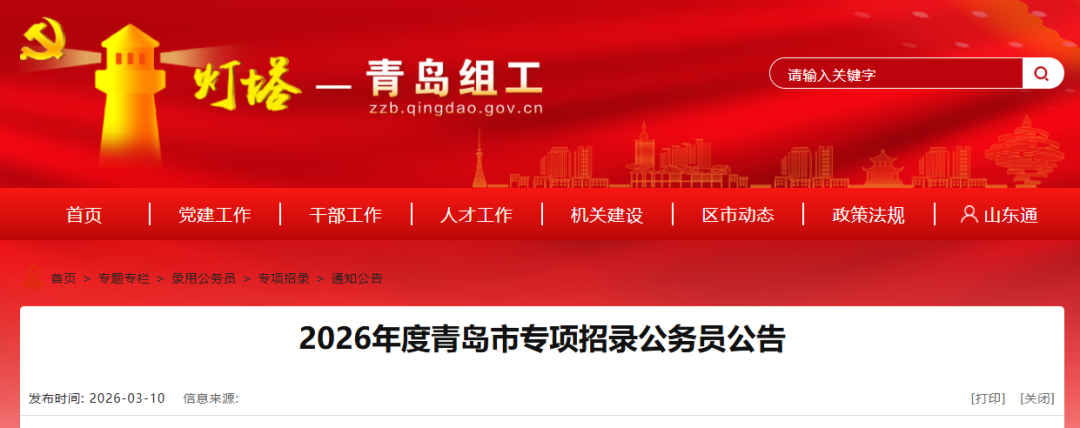 为加强公务员队伍专业化建设,推动公务员力量配置更好服务高质量发展,经山东省公务员主管部门批准同意,2026年度青岛市在“10+1”创新型产业体系、“4+4+2”现代海洋产业体系、品质城市建设、现代服务业、基础保障等5大领域专项招录急需紧缺专业公务员50名。考生可以通过灯塔-青岛组工网站(http://zzb.qingdao.gov.cn)“录用公务员”专栏中“专项招录”版块查询有关事宜。
