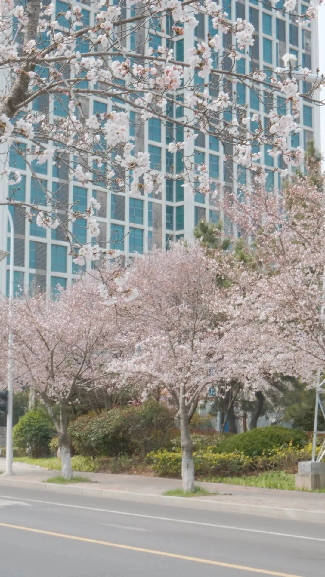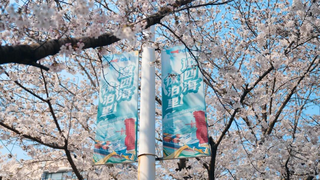 道路两侧的樱花树在空中交织,形成天然的粉色穹顶,粉白花瓣缀满枝桠,密如繁星、轻如云朵。穿行其中,风卷花瓣扑面而来,一场浪漫的“樱吹雪”如期而至;漫步花下,阳光透过花隙洒下斑驳光影,每一片花瓣都透着晶莹的光泽,山、海、花、城在此完美交融,温柔了整个春日时光。