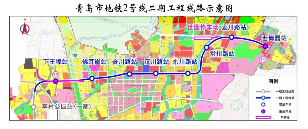 2号线二期起于李村公园站,止于世博园站,长约8.9公里,共8站10区间,换乘站2座,分别与已运营蓝谷快线和在建15号线换乘。
