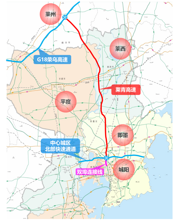 莱青高速项目是青岛都市圈的重点支撑项目,由青岛市与烟台市共同推进实施,主线全长约107公里。其中,莱州段主线23.8公里,青岛段全长83.1公里。莱青高速青岛段由北向南跨越平度、莱西、即墨三个区(市),将密切平度、莱西与青岛主城区之间的交通联系,为跨区市之间的人员流动、产业发展等提供有力支撑。