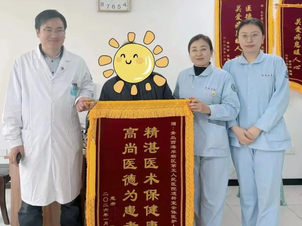 在治疗中,科室凭借精湛的医术和细致的透析管理,使患者身体状况明显改善,透析效果稳步提升;在治疗之外,医护团队始终将人文关怀融入日常,从用药叮嘱到饮食起居,从心理疏导到情绪支持,以无微不至的关怀缓解患者焦虑,让漫长的透析过程浸润着暖意。这面锦旗,承载着患者深深的感激,也折射出区第五人民医院“以患者为中心”的服务理念与有温度的专业医疗。