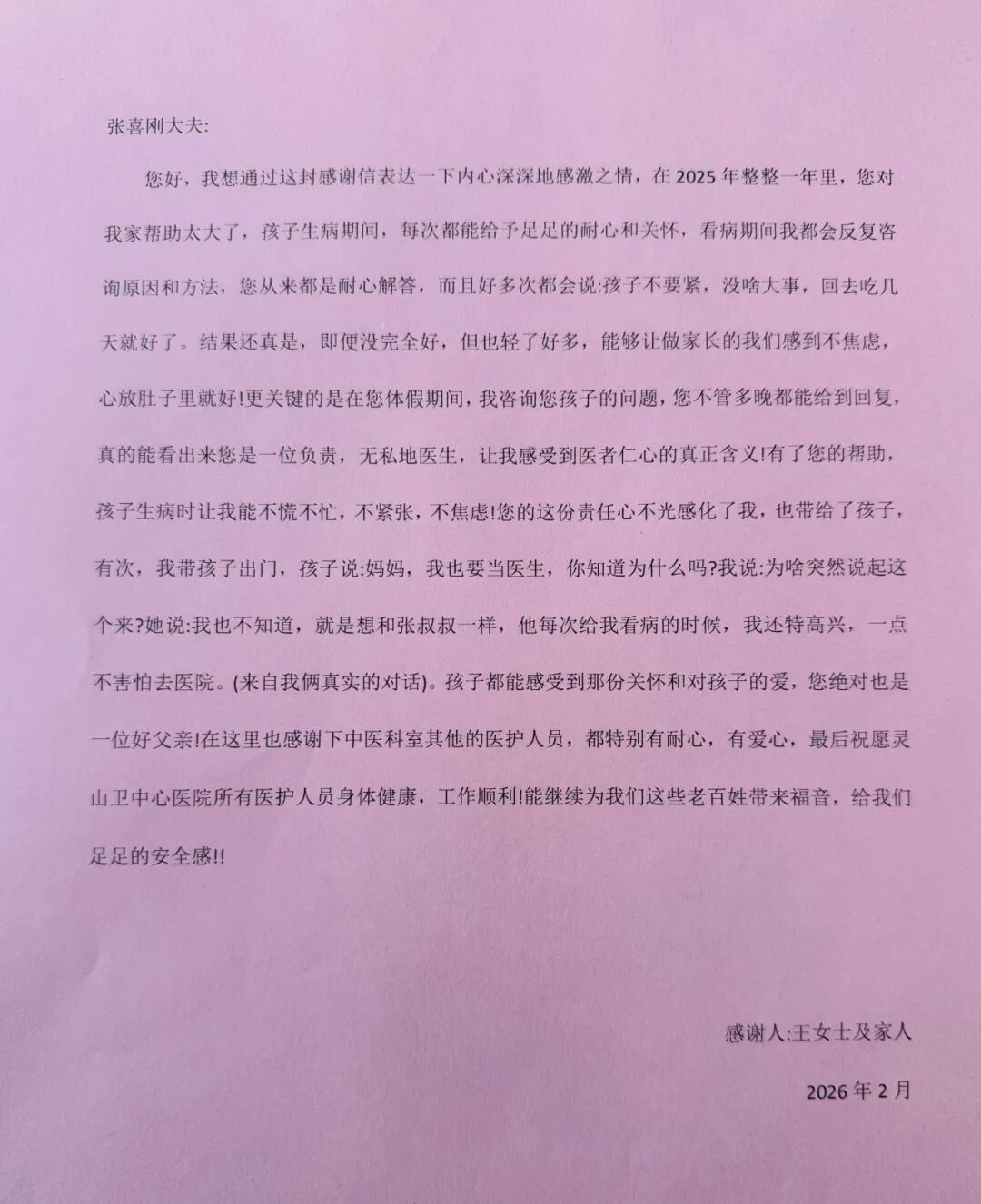 近日,灵山卫中心卫生院中医科收到了一份特别的礼物。辖区居民王女士携女儿专程到院办公室,送来锦旗、感谢信与孩子亲手制作的蝴蝶手工作品,感谢家庭医生张喜刚一年多来的精心诊疗与贴心服务。