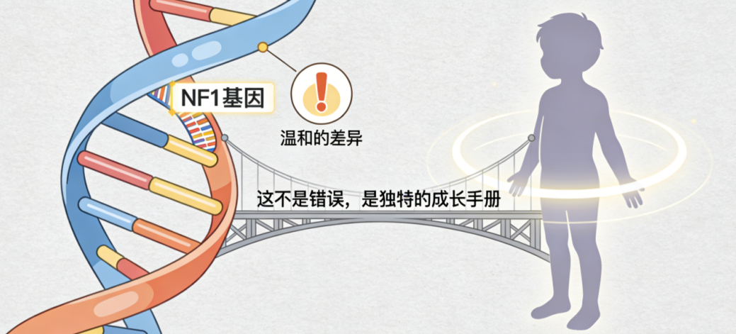 但是,对于一些特别的小朋友来说,这本书里有一个叫作NF1的部分,出现了一个小小的“印刷错误”。这个小小的不同,就让他们的身体开启了一段特别的成长旅程,医生们称这种情况为1型神经纤维瘤病,简称NF1。
