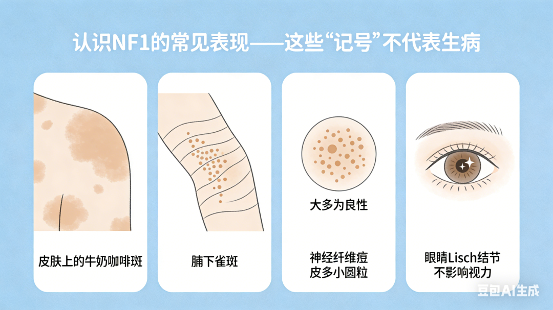在儿童保健门诊,我们偶尔会遇到身上有特殊“牛奶咖啡斑”的孩子,父母们带着关切与疑惑询问:“这些斑点是什么?会影响孩子健康吗?”——这可能是一种名为1型神经纤维瘤病(NF1)的先天状况。