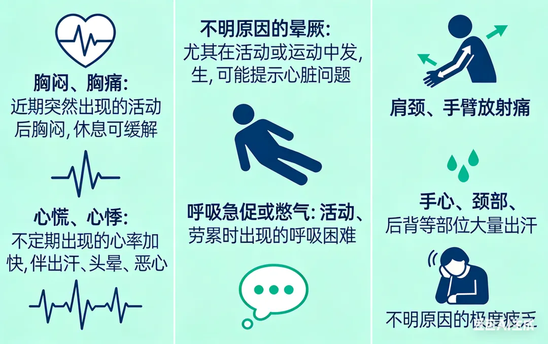 心源性猝死虽然突发,但部分患者在事发前数小时、数天甚至数月可能出现预警信号。以下症状需高度警惕: