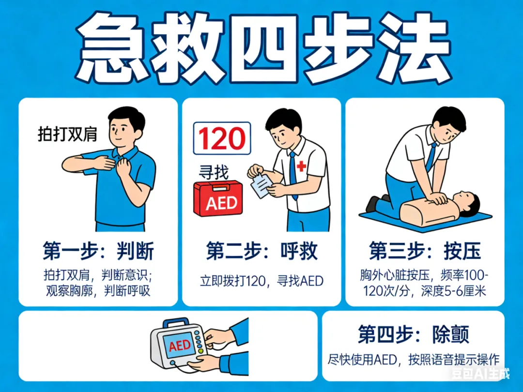 心源性猝死抢救的最佳时间是“黄金4分钟”。心搏骤停后,脑细胞在4-6分钟后开始不可逆损伤。